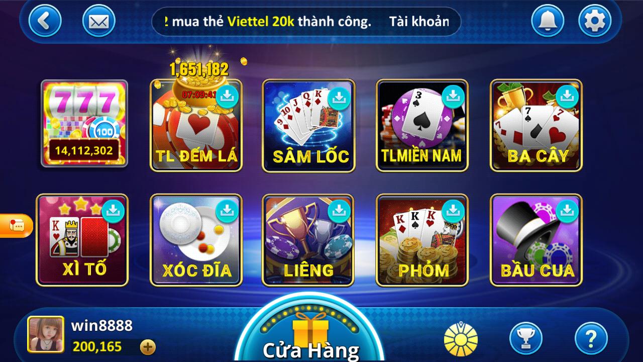 Người dùng có thể dễ dàng tìm thấy hàng loạt game bài truyền thống như Tiến Lên, Xì Tố, Poker cho đến các trò slot nổ hũ, bắn cá đổi thưởng, tài xỉu, đá gà và cá cược thể thao. Kho trò chơi không ngừng được cập nhật theo thị hiếu của người chơi và theo các dịp lễ, sự kiện trong năm.